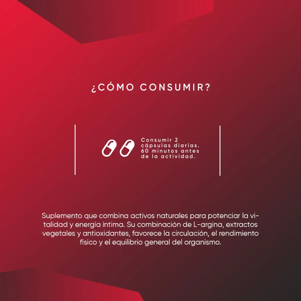 Está formulado con ingredientes que conectan con el consumidor actual: L-Arginina para estimular la circulación, adaptógenos que ayudan a gestionar el estrés, y nutrientes como Zinc y Vitamina E que apoyan el equilibrio hormonal. Es decir: una solución natural y efectiva para revitalizar cuerpo y mente.