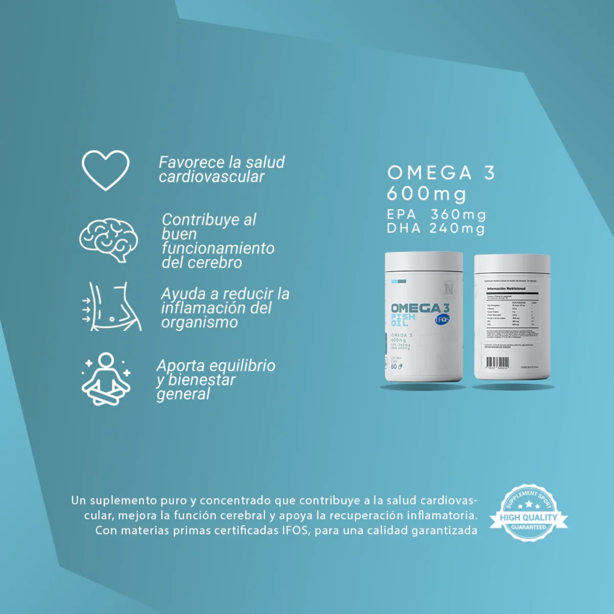 Este Omega 3 aporta 600 mg por porción (360 mg de EPA + 240 mg de DHA), dos ácidos grasos esenciales que: