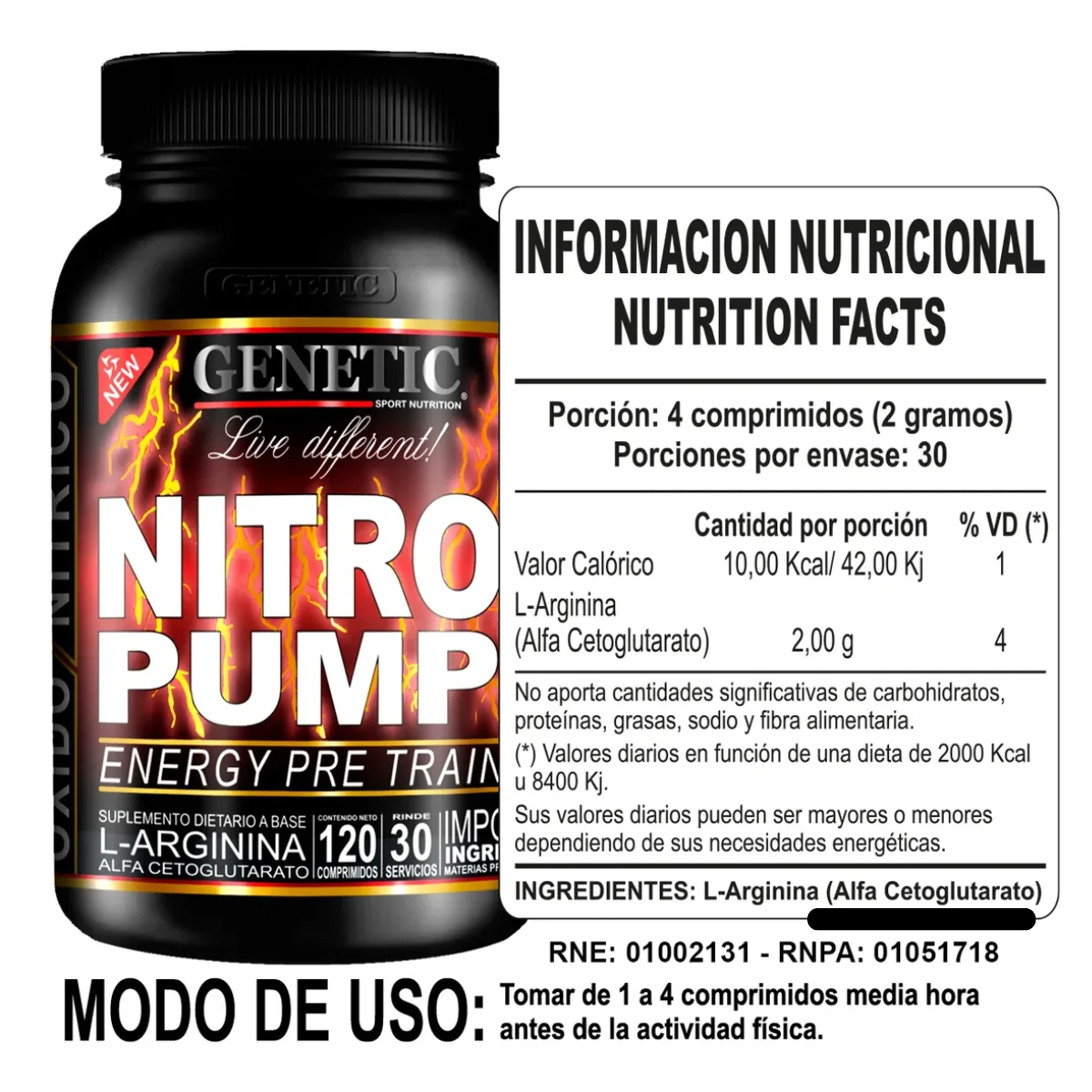 Nitro Pump es un producto de Genetic Sport Nutrition, una marca de confianza en el mundo de los suplementos deportivos. Cada frasco contiene 100 comprimidos, lo que significa que tienes suficiente para un mes de entrenamiento intenso.