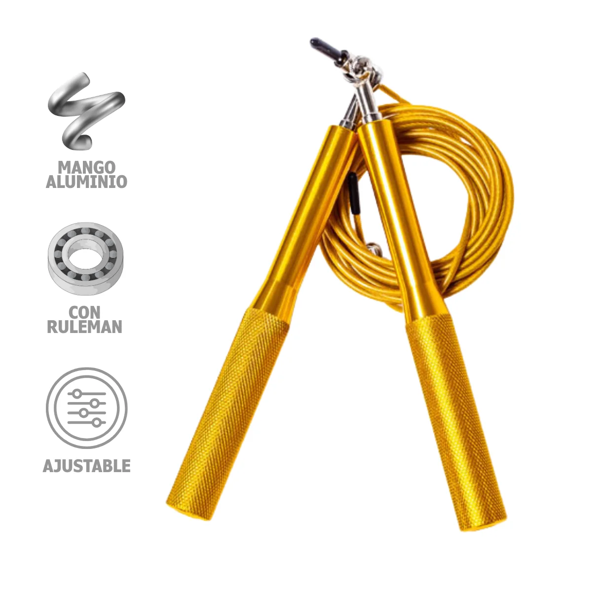 • Cable plástico resistente: No se enrosca, no se deforma y soporta entrenamientos exigentes.